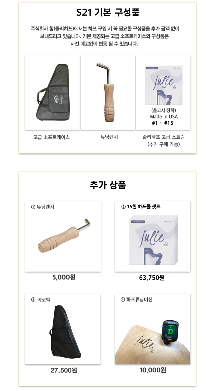 줄리 S21은 40년 경력의 하피스트가 심혈을 기울여 만든 하프이며,